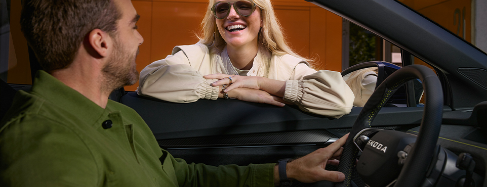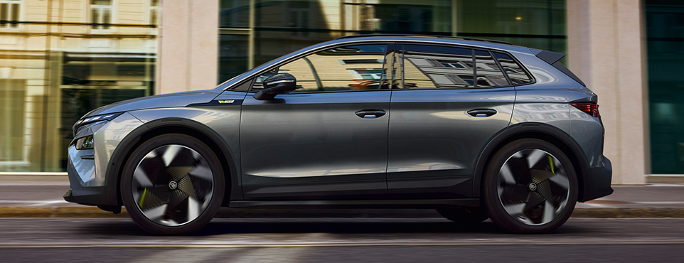 Der Škoda Elroq RS von der Seite mit einer Frau